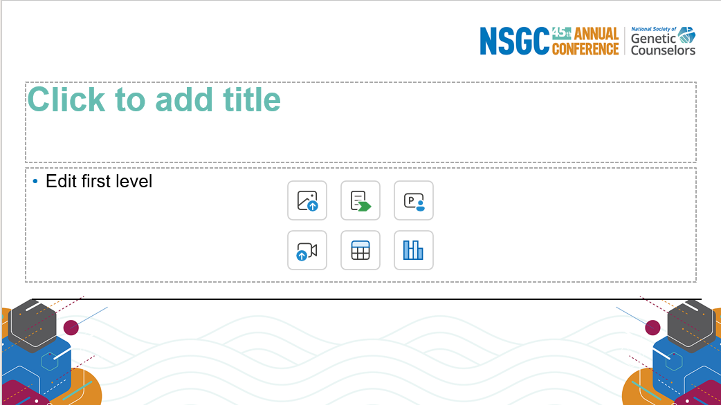 All conference participants must use the approved NSGC PowerPoint Template for their presentation. This template has been created to meet accessibility standards. Prior to submitting your presentation, please confirm the following: